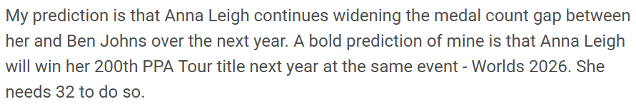 Speaking of Jack Sock, I have a bold prediction that he will win his first PPA Tour singles title in 2026. This won’t be his first gold on the PPA Tour in history. Remember when he won mixed doubles in a watered down field (pun intended) in the 2023 North Carolina Open with Anna Leigh Waters?