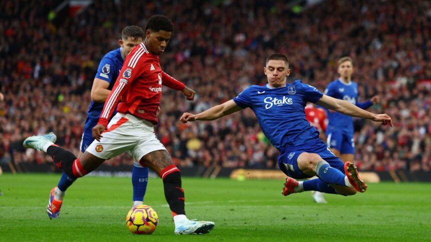 Rashford đưa United vượt lên dẫn trước ở phút thứ 34 khi anh lao vào sút quả phạt góc của Bruno Fernandes bằng cú vô lê bằng chân chạm chân của hậu vệ Jarrad Branthwaite của Everton.